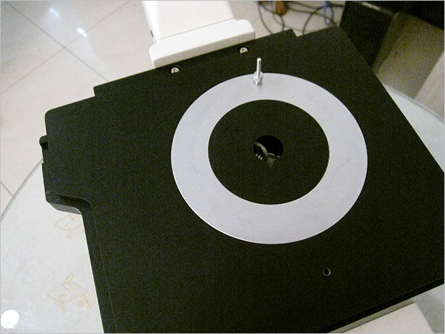 圓形可旋轉(zhuǎn)載物臺板尺寸:最大外徑Ф130mm,最小通光口徑小于Ф12mm.